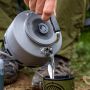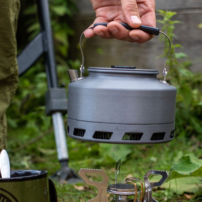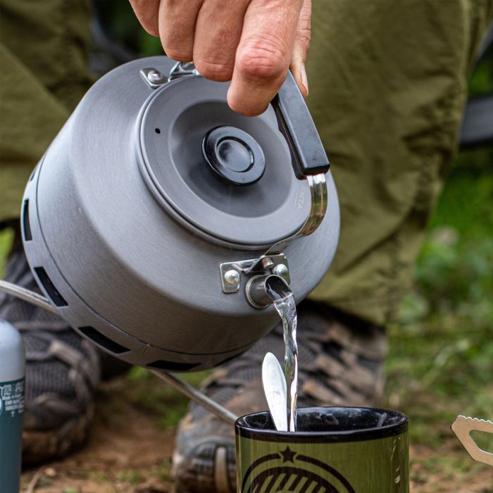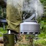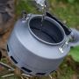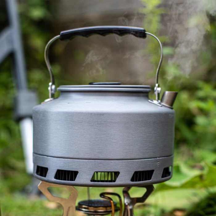 Mit dieser Mehrleistung kocht er nicht nur schneller, sondern er spart Ihnen auf die Dauer den Treibstoff. Er hat eine Kapazität von 1,1 Liter. Ein hitzebeständiger Klappgriff, hält ihn kompakt für den transport und mit seinem 210g Aluminium, ist er dazu auch leicht.
