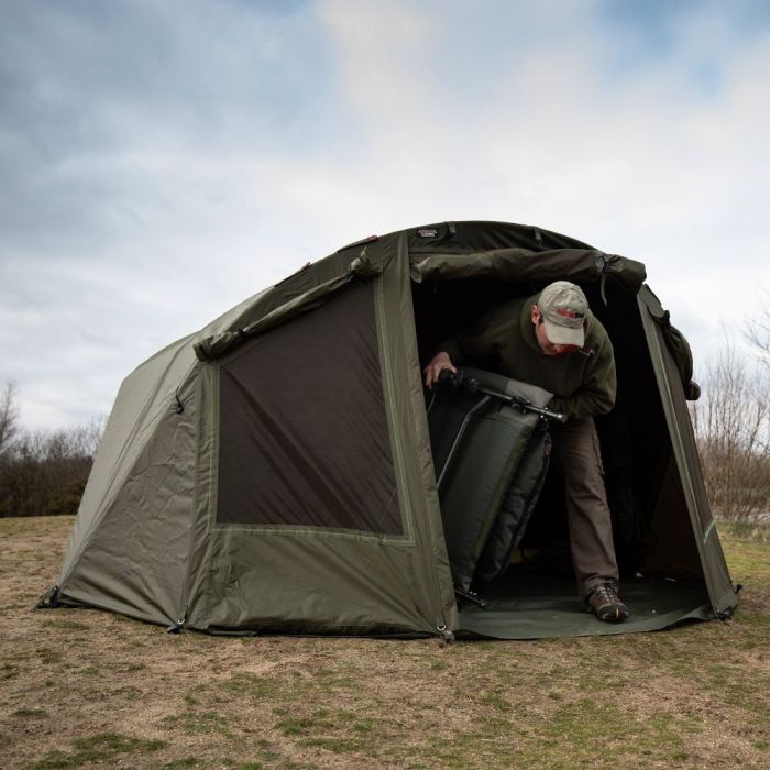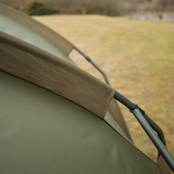 Das Bivvy kann durch die zwei Höheneinstellungen an der Front auf die von Ihnen gewünschte Höhe eingestellt werden, und die Zwei-Wege-Briefkasten-Türeinlage bedeutet, dass Sie etwas Licht und Brise hereinlassen können, während Sie gleichzeitig ein vernünftiges Maß an Privatsphäre bewahren.