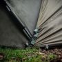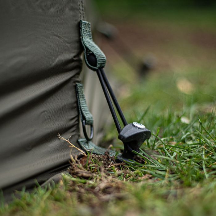Die Uni-Veranda verfügt über drei höhenverstellbare Einstellhaken, damit Sie die Verandaabdeckung je nach Terrain und der Höhe Ihres darunter liegenden Bivvys individuell einstellen können. Zur Unterstützung beim Einstellen hat die Veranda Spannstangen um auf fast alle Ein-Mann-Bivvys, mit Haube, zu passen.