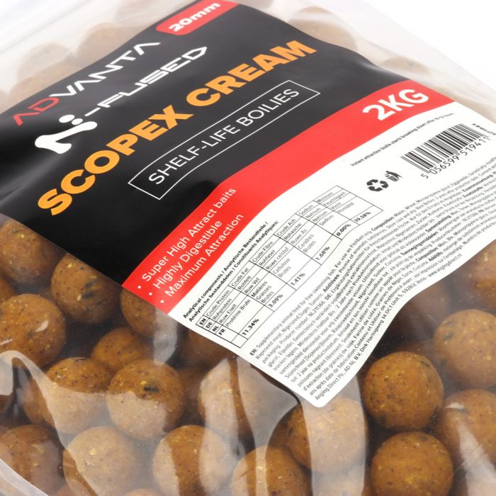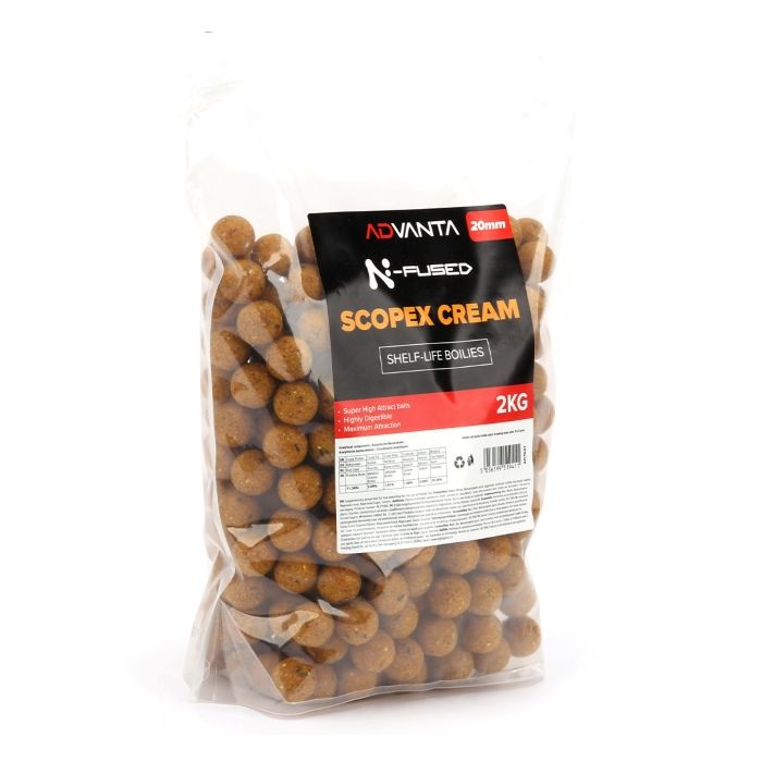 The Advanta N-fused boilie range is made using the highest quality ingredients and flavours to create an all-year-round bait that is both affordable and attractive to fish. The Advanta N-fused bait comprises of a blend of flours, fish extracts and added salt, something carp love and will actively seek out! The Advanta N-Fused boilies are available in three flavours, Monster Fish, Scopex Cream and Super Spice meaning there is a flavour to suit your angling and the time of year you are fishing in the range. The flavour profiles of each of the 3 flavours within the range has been developed to offer a year-round bait solution with high attract flavours and colours to pull fish in from far and wide. The Advanta N-Fused boilie range offer excellent value for money and convenience by offer 2 sizes of bait and 2 sizes of bag to offer a suitable product for all anglers’ requirements. The Advanta N-fused boilies are available in 15 and 20mm in both 2 and 5kg bag sizes. The 5kg bags feature the feed boilies that are perfect for pre-baiting and offer the best value for money for anglers who want to establish a bait on their chosen water.