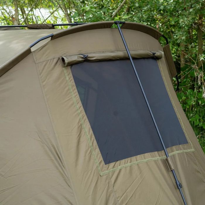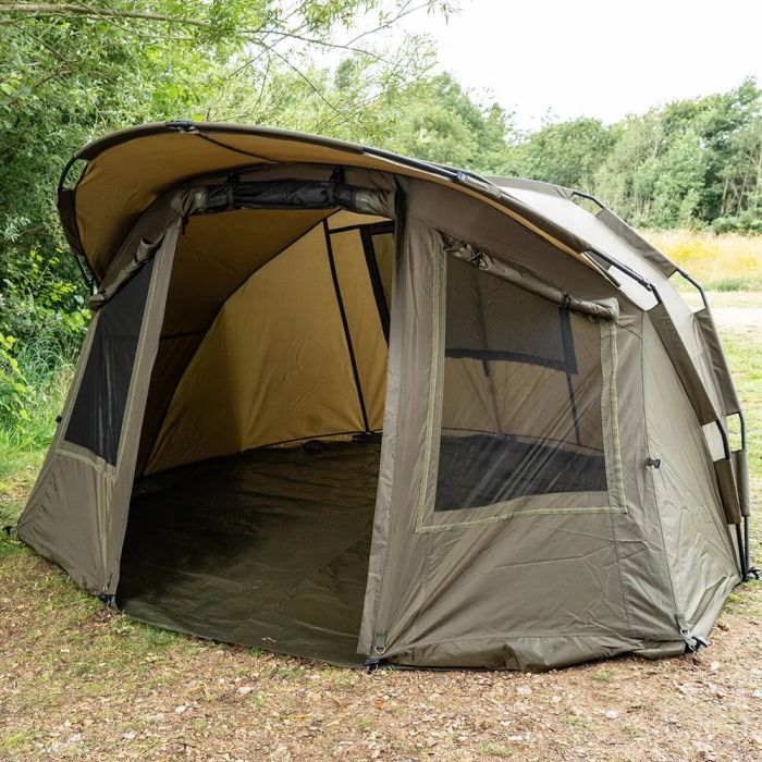 The Advanta Peak V2 2 Man Bivvy is a spacious bivvy for fishing that can easily accommodate 2 anglers and all their kit for long sessions or overnight stays. The carp bivvy uses a clever design to maximise internal space and has plenty of room for two bedchairs as well as any carp fishing luggage and tackle you require.