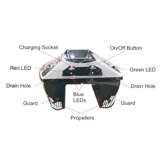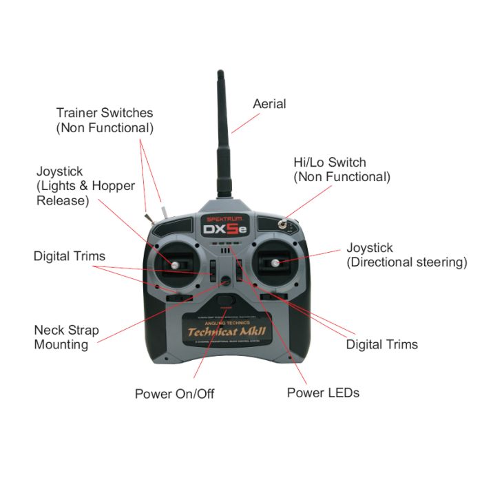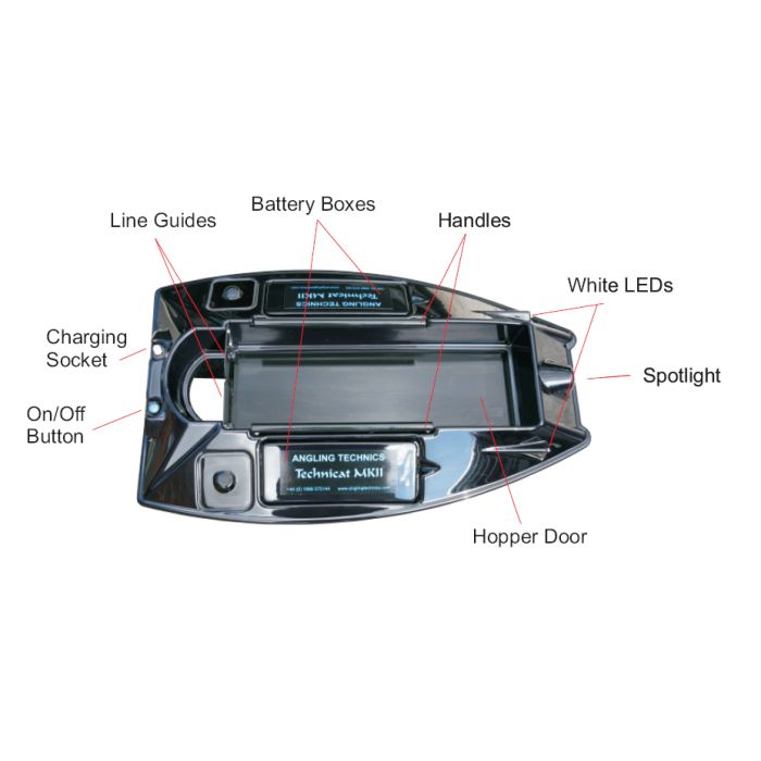 Das Futterboot wird über ein 2,4 Ghz FM 4-Kanal-Funksystem betrieben, das deutlich weniger Störungen aufweist als andere funkbetriebene Systeme. Die Empfangsantenne ist im Inneren untergebracht, wodurch die Gefahr für das Einfangen von überhängendem Laub in der Nähe reduziert wird und es stört auch die Reichweite der Technicat MKII in keiner Weise. Das Futterboot fährt vorwärts so schnell wie rückwärts und ist mit 6 ultrahellen Navigations-LEDs und einem "Suchscheinwerfer" ausgestattet, der über die Fernbedienung eingeschaltet werden kann. Die Batterien sind leicht austauschbar, da sie in separaten Kästen untergebracht sind. Durch die Katamaranform ist das Technicat sehr stabil im Wasser, so dass auch starker Wind und hohe Wellen kein Problem für dieses Boot sind.