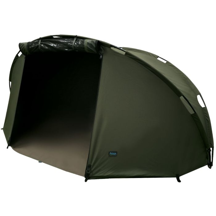 Der Eingang zum Bivvy hat eine Doppel-Reißverschlusstür mit Haltegurten und ein Vordach an der Vordertür (hierfür sind Sturmstangen erforderlich) für zusätzlichen Schutzraum. Es gibt eine einzige Belüftungsöffnung hinten, um die gesamte kondensierte Luft abzulassen, ein Klarsichtfenster und eine strapazierfähige Bodenplane, die dafür sorgt, dass der Innenraum sauber und trocken bleibt.