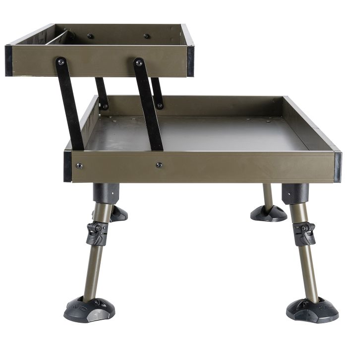 Der Double Decker Bivvy Tisch ist der erste seiner Art, mit zwei Etagen, um alle Ihre wesentlichen Gegenstände perfekt zu lagern. Halten Sie Ihre Wertsachen von Ihrem Angelzubehör getrennt, indem Sie die Wertsachen auf der oberen Etage sicher aufbewahren, während Sie auf der unteren Etage immer noch viel Platz für Ihre Geräte haben. Die obere Etage besitzt eine Halterung an der hinteren Kante, die dazu benutzt werden kann, Ihr Tablet oder Smartphone in der perfekten Position zu halten, um Videos auf Ihrem Gerät anzusehen.