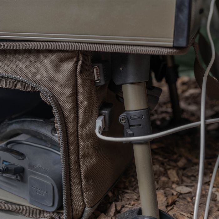 Das untere Fach hat 2 USB-Anschlüsse, so das Sie jetzt Ihre wertvollen Powerbanks in der Tasche aus dem Wege aufbewahren können, während Sie Ihre Geräte immer noch auf der Tischfläche aufladen können.Sie Können auch große Koch- und Brühgeschirr dort aufbewahren. Der doppelte Bivvy Organiser wird auch mit einer Gaskanistertasche geliefert, die an beiden Seiten der Tasche festgeklippt werden kann. Das System ist großartig, wenn Sie eine Reihe Angelgeräte jederzeit griffbereit haben wollen, wenn Sie öfter angeln.