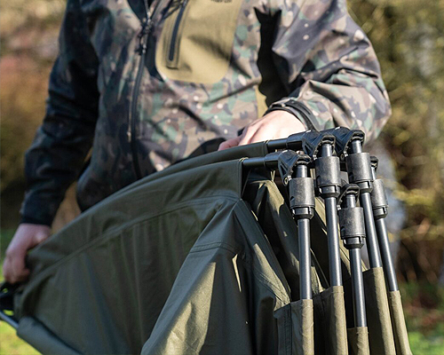 Die schnelle Aufbauzeit dieser Angelzelte ist dem neuen Rapid Knuckle System zu verdanken. Dieses System ermöglicht es, dass alle fünf Hauptstangen sich in einer mühelosen Handbewegung verriegeln.