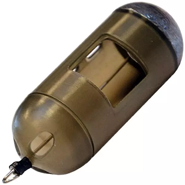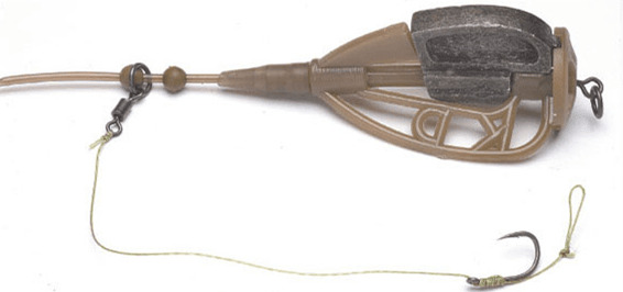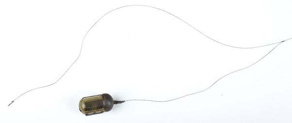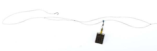 Ideal, wenn am Futterplatz bereits einige Fische sind und in Kombination mit einem Käfig- oder Plastikkorb. Dieses Rig besticht durch seine einfache Bauweise. Die Hauptschnur läuft frei durch den Feeder und zeigt kleinste Zupfer zuverlässig an, der Fisch spürt dabei nicht das Gewicht des Korbs.