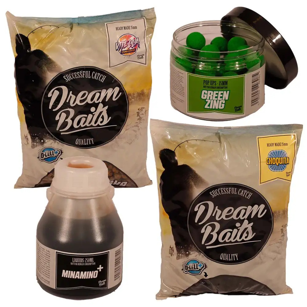 Das Dream Baits Spring Bait Angebot umfasst Vitella Readymades sechs Kilogramm, Choquita Readymades sechs Kilogramm, Minamino+ dip 250 Milliliter sowie Green Zing Pop-ups. Das perfekte Paket für den Frühling, wenn die Wassertemperaturen langsam wieder ansteigen! Beide Readymades basieren auf einer rasch verdauliche Basis. Die Zusammensetzung ist fruchtig und frisch.
