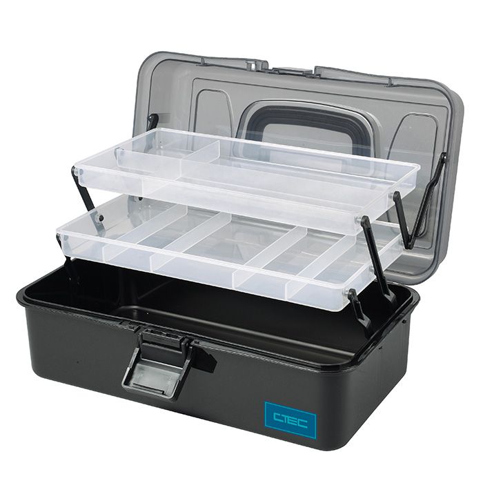 Die edle Optik dieser schwarzen Tacklebox mit Gun-Smoke-Aufsatz bietet ausreichend Platz für Allround-Angelgeräte.