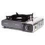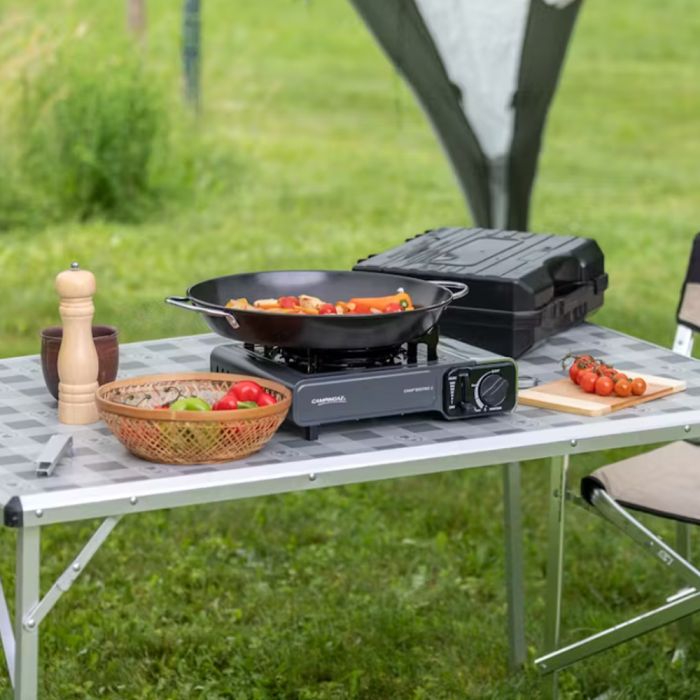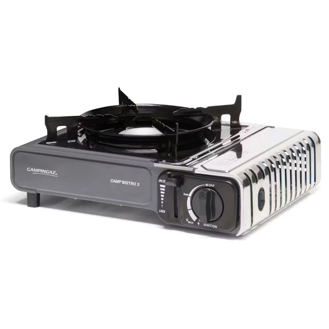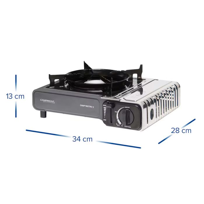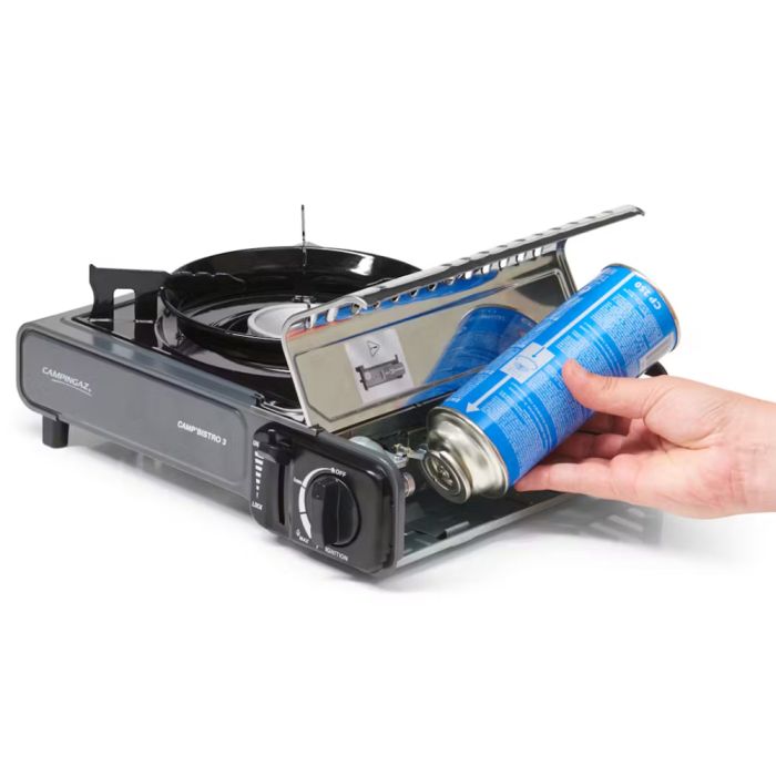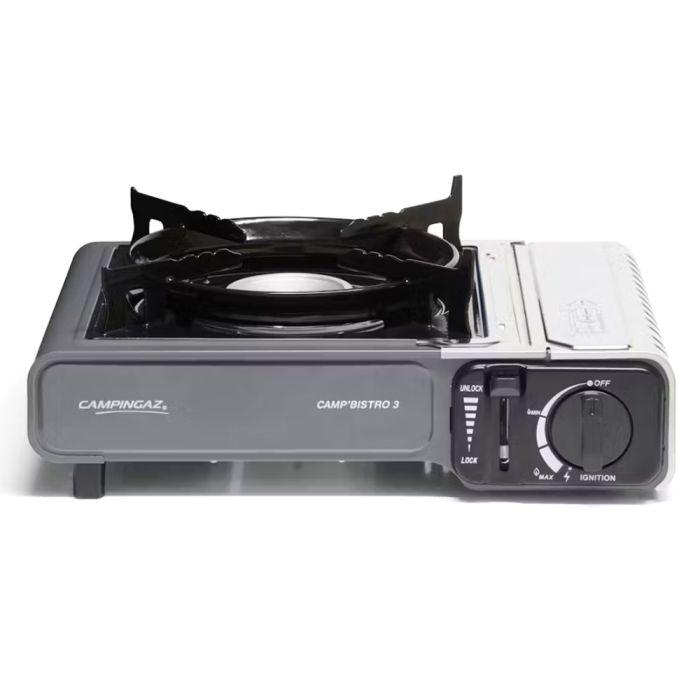 In addition to being extremely portable and easy to use, this updated model of the Campingaz® Camp’Bistro stove has many additional safety features ensuring it now conforms to the latest European Safety Standards for all flat bed stoves. These safety features include: Two gas safety mechanisms within the stove, one allows the gas cartridge to be ejected when not in use and the other automatically cuts the gas flow should the gas compartment become overheated. The pan support continues to be fixed in place ensuring it cannot be removed and incorrectly repositioned. These pan supports are elevated and designed to prevent a larger pan from protruding over the gas cartridge compartment, preventing heat from being reflected downwards towards the cartridge causing overheating. Piezo ignition allows safe, match-free lighting. The vented cartridge compartment cover is designed to fall shut, preventing it from remaining open whilst the stove is in operation. A fixed panel on the bottom of the stove prevents a cartridge being stored underneath and being accidentally left there when lighting the stove. The stove has raised feet which lift it away from the surface it is sitting on, allowing additional ventilation. When no longer required, the Camp’Bistro 3 stove is stored in its own hard carry case manufactured from recycled plastic.