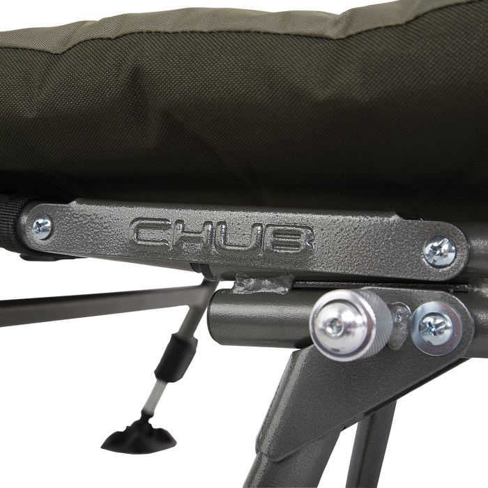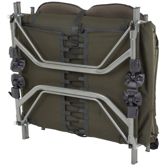 Die Beine lassen sich für den Transport oder zur Einlagerung flach gegen die Unterseite des Bedchairs falten, während beim Aufstellen desselben am Wasser die griffigen Leg Locks ihn stabil auf jedem Terrain stehen und gegen das wildeste Wetter trotzen lassen. Übergroße Matschfüße sorgen dafür, dass Sie die Liege überall dort aufstellen können, wo Sie sein müssen, und gleichzeitig, dass Sie eine robuste und sichere Schlafplattform an jedem Gewässer errichten können.