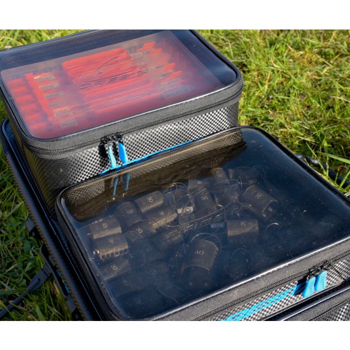 Die wasserdichte EVA Zubehörtasche bietet Platz für zahlreiches Zubehör, wie Feeder, Rigs, Rollen und anderes Tackle. Durch den durchsichtigen Deckel ist der Inhalt direkt sichtbar.