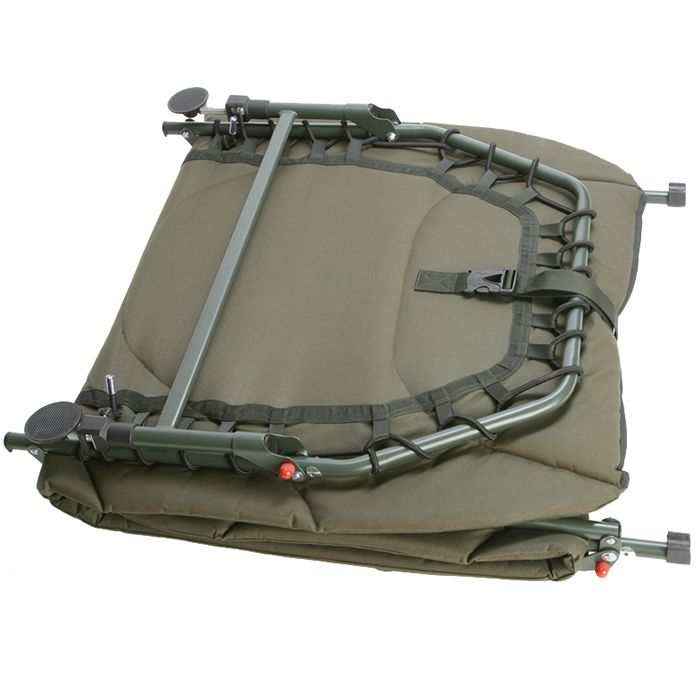 Der Black Widow Bedchair ist um einen Stahlrahmen herum konstruiert und verfügt über eine gepolsterte Matratze sowie ausziehbare Beine mit drehbaren Schlammfüßen. Das Beinverriegelungssystem sorgt für eine stabile Montage, und er lässt sich zum einfachen Transport auf eine kompakte Größe zusammenklappen, wobei der Betchair mit einem Gurtband mit Klickverschluss versehen ist.