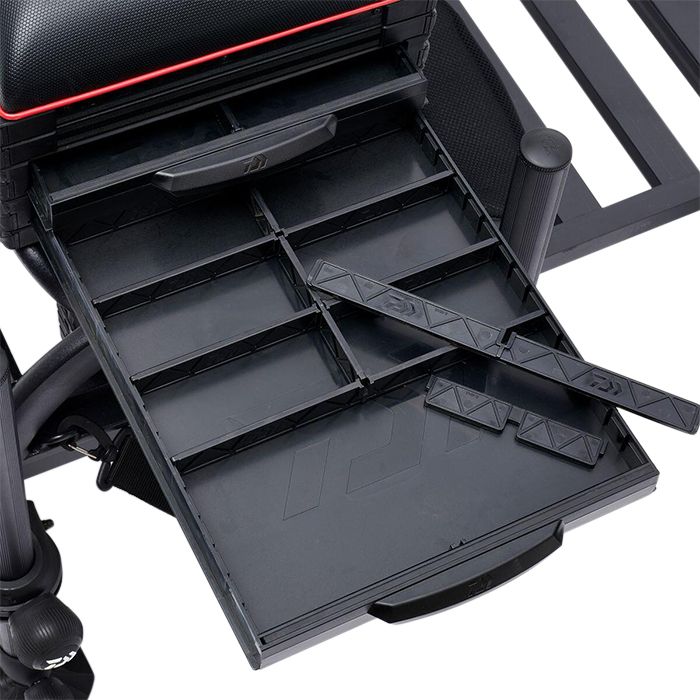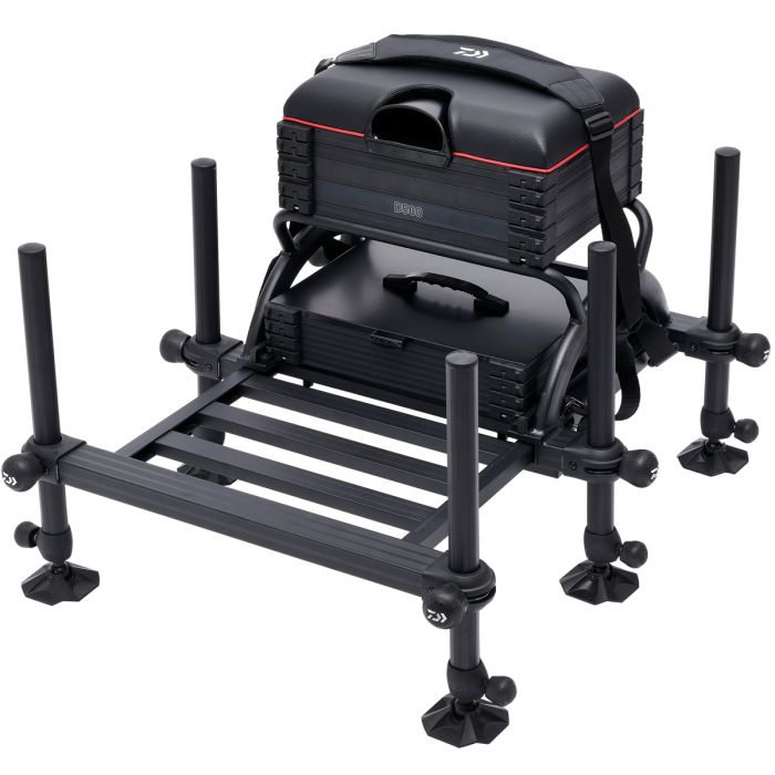 Die Daiwa 500 ist eine vielseitige modulare Sitzkiepe. Ausgestattet mit einem "One-Touch"-Clip-System um die Ablagefächer zu öffnen und zu schließen, bietet diese Box mit Teleskopfüßen einen einfachen Zugang. Diese Sitzkiepe kann sehr niedrig auf ebenen Böden oder Plattformen platziert werden.