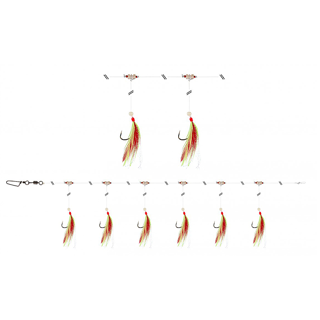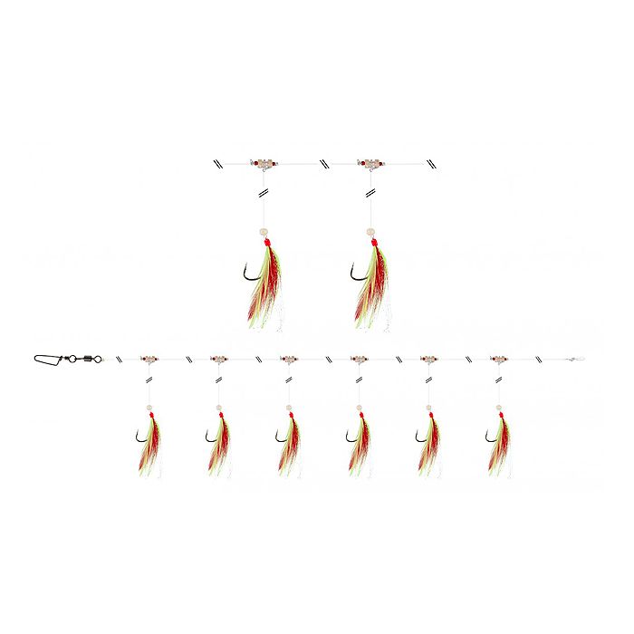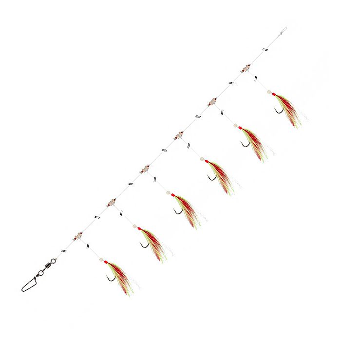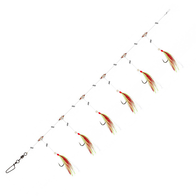 Klassisches Makrelenvorfach aus Federn. Durch die Rotationsperle verwickelt das