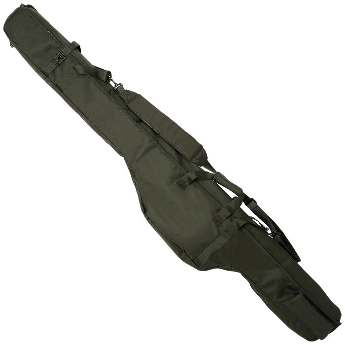 Der Holdall bietet außerdem die Möglichkeit, zwei zusätzliche Rutenkoffer an der Außenseite zu befestigen und auf der Rückseite können Banksticks, Kescher usw. in einer Aufsatztasche transportiert werden. Mit einem abnehmbaren Schultergurt und gepolsterten Tragegriffen ist er recht komfortabel.