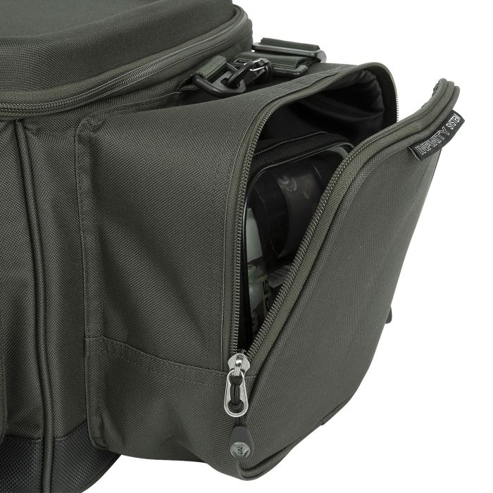 Es gibt drei große Staufächer für Tackle-Boxen, kleinere EVA-Boxen und Banksticks, Bissanzeiger usw. und das große Innenfach ist so konzipiert, dass vier der mittleren Zubehörtaschen oder zwei der großen Kühltaschen hineinpassen. Diese Tragetasche bietet Flexibilität sowohl für kurze als auch für längere Angeltouren.