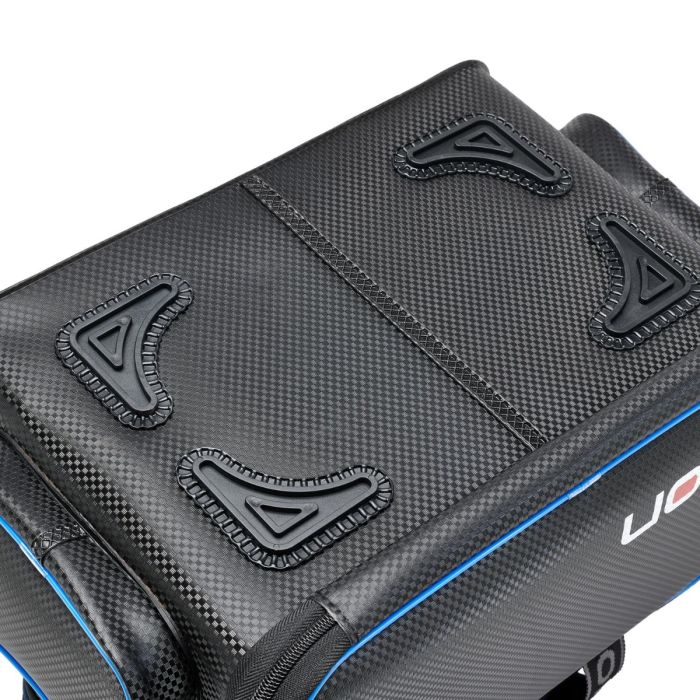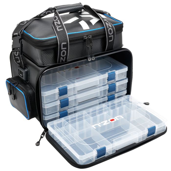 Diese 4-Box-Version ist zweiteilig aufgebaut, im Hauptfach befinden sich vier Tackleboxen, die von vorne über eine runde Reißverschlussklappe zugänglich sind. Außerdem besitzt es zwei runde Reißverschluss-Seitentaschen für den schnellen Zugriff auf kleinere Accessoires. Das mit Klettverschluss gesicherte obere Fach lässt sich abnehmen, damit Sie beim Angeln die benötigte Ausrüstung und die Kleinteile einfach herausnehmen können. Zum Transport gibt es einen verstellbaren gepolsterten Schultergurt und Klettverschlussgriffe.