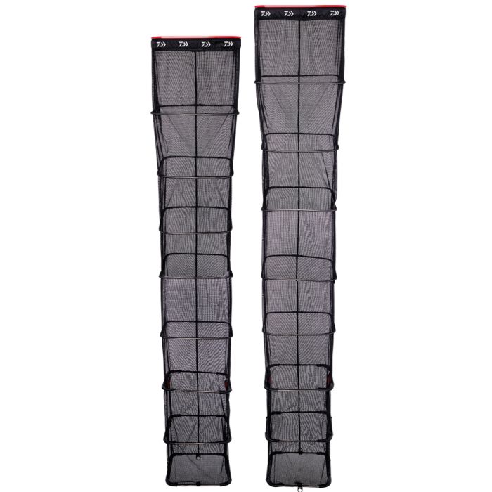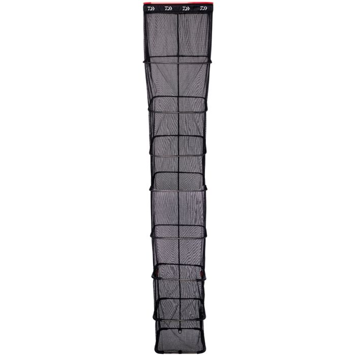 Das feine, knotenlose Netz nimmt nur wenig Wasser auf, trocknet sehr schnell und schont die Fischhaut. Um einen sicheren Halt im Wasser zu erreichen, hat das Netz einen einzigartigen Daiwa-Verschlussblock mit starken Aluminiumringen, und ein äußeren D-Ring am Ansatz, um das lange Netz zu verankern. Oben am Setzkescherrahmen befinden sich zwei robuste Tragegriffe, um den Fang leicht zu wiegen und zu transportieren. Der quadratische Setzkescher kann einfach eingesammelt und zusammengefaltet werden, um ihn bequem zu lagern.