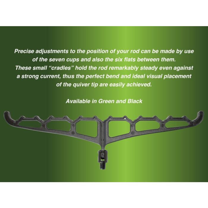 Mit den 7 Mulden und den dazwischen liegenden 6 Flächen können Sie die Position Ihrer Rute präzise einstellen. Diese kleinen Halterungen halten die Rute auch bei starker Strömung bemerkenswert stabil, damit eine perfekte Biegung und eine ideale optische Platzierung der Feederspitze problemlos möglich sind.