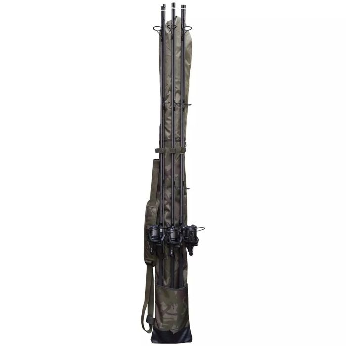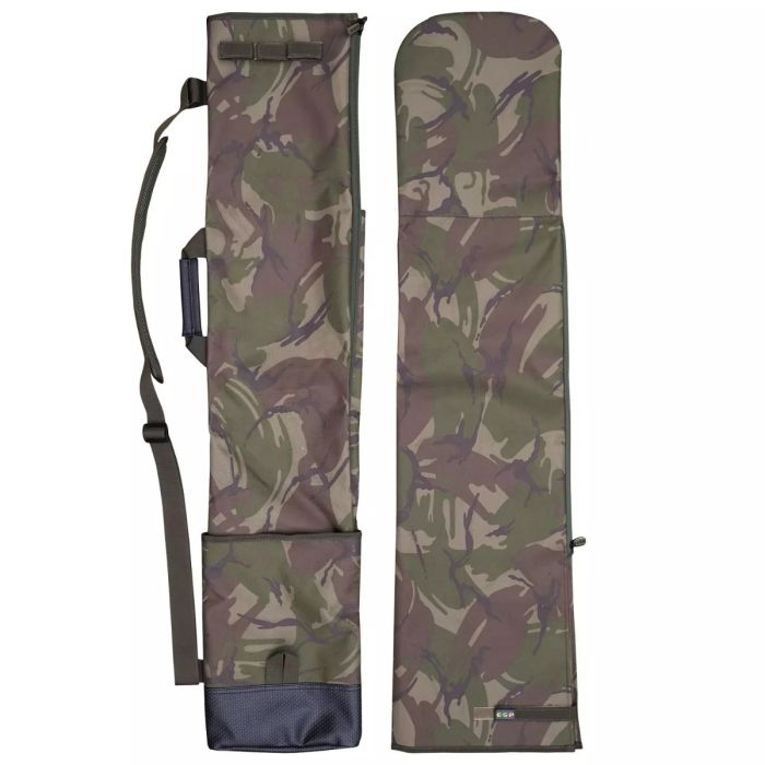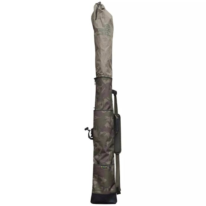 Secure compact transport for rods & brolly; Tough 600D PU backed polyester; Perfect muted camo pattern; Pocket for the rod butts; Velcro/webbing straps to attach the rods at the upper end; Small webbing loop at the base for lifting into vehicle; Central compartment for brolly & net; Three-quarter length chunky zip for easy access; Two bankstick pockets; Adjustable padded shoulder strap and carry handle; Zipped sleeve goes over top of quiver for extra protection; Quiver dimensions (including external pocket); 115cm long x 23cm wide;
