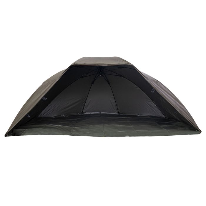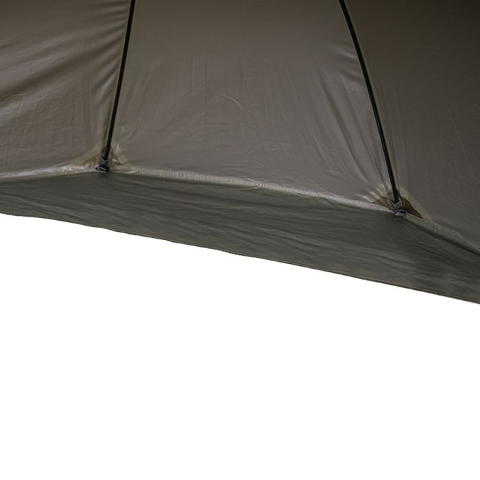 Der Verzicht auf Sturmstangen spart Gewicht, und ohne die 8 Heringe und die leichte Tasche, in der der Brolly untergebracht werden kann, bringt er nur 3,70 kg auf die Waage (Gesamtgewicht mit Tasche und Heringen 4,40 kg).