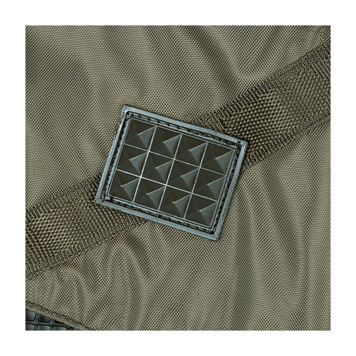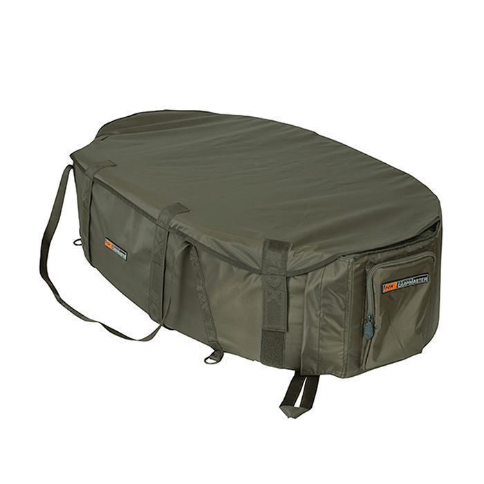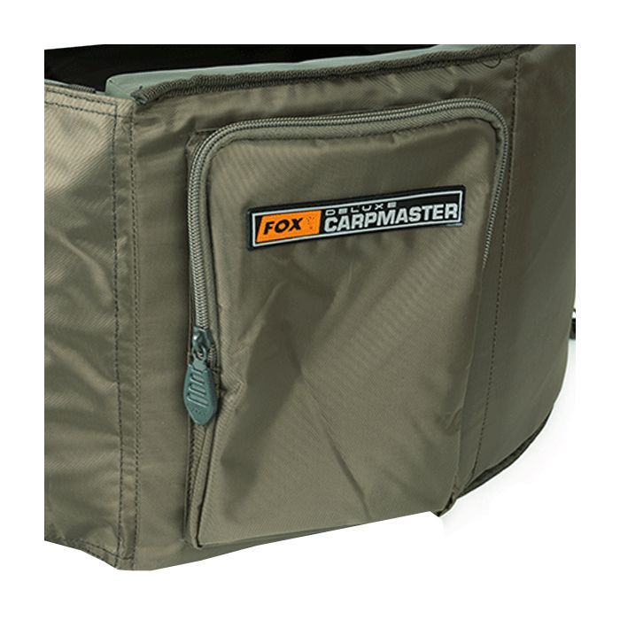 Eine große Reißverschlusstasche zur Aufbewahrung von Karpfenpflegegeräten, Waagen und Wiegeeinrichtungen ist ebenfalls an den hohen Seiten angebracht. Es gibt auch Schlaufen zum Aufhängen und Ösen zum Einhaken, um sicherzustellen, dass sich die Matte bei Windstößen nicht bewegt.