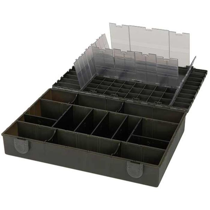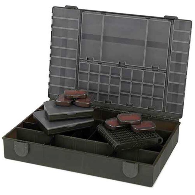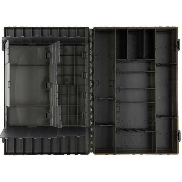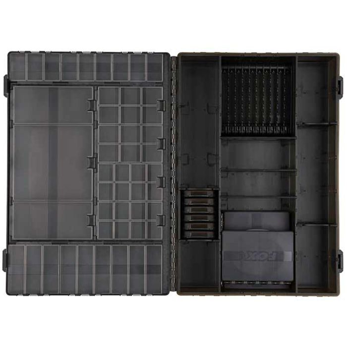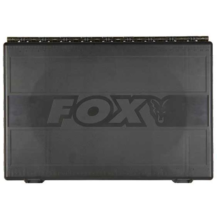 Fox Edges Large Tackle Box Loaded For the serious angler who seeks organisation and efficiency on their fishing excursions, the Fox Edges Large Tackle Box Loaded provides an optimal storage solution, tailored to meet every tackle need. Packed with a range of specific compartments and features, it assures you won't spend unnecessary time rummaging for the right piece of equipment. At the heart of this tackle box, you'll find a generous offering of storage options: 1 x standard adjustable box for versatile storage of varying tackle sizes. 1 x XL adjustable box to cater for those larger, bulkier items. 1 x XL leader rack ensures your leaders remain untangled and ready for action. 6 x hook boxes to keep your hooks sharp and separate. Lid with 49 individual compartments to systematically segregate and access smaller essentials swiftly. A distinct feature of the lid is the smoked tinted closers, offering the dual advantage of protection from external elements whilst granting you a clear view of the contents. Precision is paramount in angling, and to support that, the box lid opens to a precise 180 degrees, creating an easy platform for rig tying when the box is placed on your lap. Further enhancing this utility, the box features a ruler, thoughtfully placed both inside and outside the lid, proving indispensable for those who demand exact rig lengths. Constructed with the angler's needs at the forefront, the base of this tackle box is designed to snugly house all Edges internal boxes and accessories. Whether it's rig tools, standard hooklength spools, or even the larger leader style spools, the Fox Edges Large Tackle Box Loaded ensures everything finds its rightful place. An aspect worth noting is the inclusion of VCI (Volatile Corrosion Inhibitor) technology. A safeguard that's particularly beneficial for those unavoidable damp days, VCI is ingeniously infused into the tackle box to slow down the corrosion of metals, ensuring the longevity of your tackle items even if the inside becomes wet. Organisation is further elevated with the provision of: 3 large dividers to keep main items apart. 2 small dividers for more delicate or lesser-used items. 2 splitter dividers and 2 horizontal dividers offering a meticulous compartmentalising solution. Ensuring durability, the box boasts pinned hinges, designed to withstand the test of time and repeated use. With dimensions measuring 35cm x 25cm x 7cm, this tackle box is both spacious and compact enough for easy transport. As an added touch, a sticker pack is included, offering anglers the freedom to personalise their box or to use for easy identification.