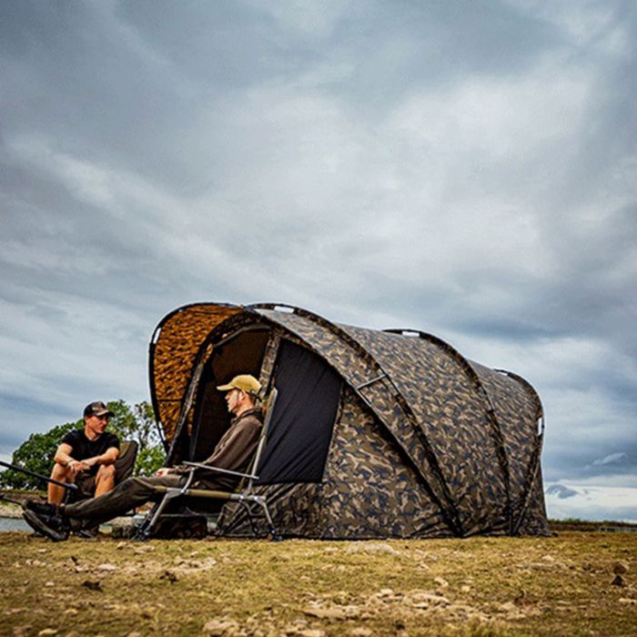 Dieser 2-Mann Bivvy ist basiert auf einem klassisch weiterentwickelten Kinderwagen-Vierrippen-Design mit einer übergroßen Spitze für Wetter- und Regenschutz. Er hat auch zusätzlichen Raum und Kopffreiheit durch den extra-hohen Rahmen.