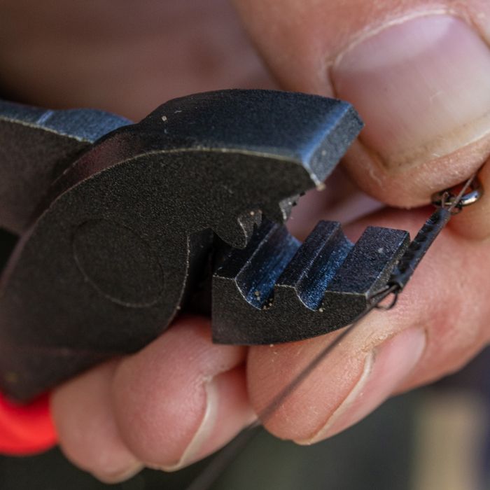 Die Zange un Ihre eigene starke Quetschverbindung auf Spuren zu schaffen, sie quetscht Quetschhülsen ohne Spannung oder scharfe Kanten zu erzeugen, d.h. Sie können akkurate Riggs sehr einfach herstellen. Außerdem können Sie damit auch sehr kurze Riggs, wie z.B. ein Chod Rigg oder Hinged Stiff Rigg sehr leicht anfertigen.