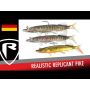 Hecht frisst Hecht - niemand bezweifelt das. Und genau hier kommen die neuen Realistic Replicant Hechteköder ins Spiel. Sie sind in verschiedenen Größen erhältlich, wobei dieser neue Kunstköder enorm realistisch ist und der große Paddelschwanz eine schwungvolle, rollende Aktion erzeugt, dem kaum ein Hecht widerstehen kann.