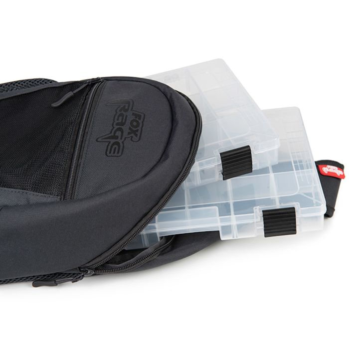 Light weight rucksack solution for the mobile angler, single strap offers quick access to bag storage. Comfortable padded carry strap. Main compartment loaded with 2 medium shallow boxes.
