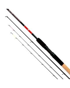 Feederruten sind die beliebteste Rutenoption in unserem Sortiment für das Fried- und Matchfischen. Eine Feederrute wird zum Angeln mit Köder auf dem Grund verwendet, ohne die Verwendung einer Pose. Dies macht diesen Rutentyp zu einer idealen Wahl für den Friedfischangler, der auf größere, kommerziell genutzte Karpfen sowie auf einige bodennahe Grobfische fischen möchte. Wie der Name schon sagt, ist eine Feederrute am besten für die Verwendung mit einem Futtersystem geeignet, unabhängig davon, ob Sie einen offenen Käfig oder einen modernen Methodfeeder verwenden. Sie kann jedoch auch verwendet werden, um Ihren Haken auf Freebie-Köder auf verschiedene Weise zu präsentieren. Feederruten werden in der Regel mit einer bis drei Spitzen geliefert. Diese unterscheiden sich in der Regel in ihrer optimalen Wurfgewichtung. Dadurch verfügen Sie über eine veränderbare Empfindlichkeit, was der Rute eine große Vielseitigkeit verleiht und sicherstellt, dass Sie auf eine Vielzahl von Orten und Wasserbedingungen zielen können. Spitzen, die aus Kohlefaser hergestellt sind, haben tendenziell eine viel stärkere Bewertung als Spitzen, die aus Glasfaser hergestellt sind, uns sie können auch mit Begriffen wie "leicht", "mittel" und "schwer" klassifiziert werden. Die Gesamtlänge der Rute kann zwischen 9 Fuß (2,74 m) und 12 Fuß (3,66 m) liegen. Dies ermöglicht Ihnen einen präzisen Wurf über eine ganze Reihe von Entfernungen mit Zuversicht. Spitzenmarken die Feederruten bieten sind Shakespeare, Shimano und Daiwa