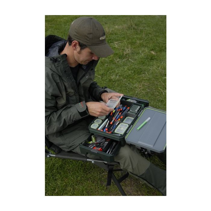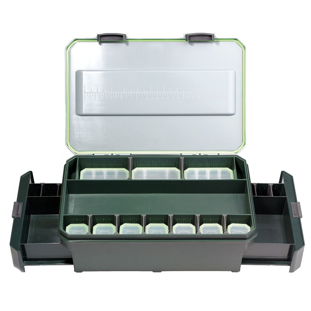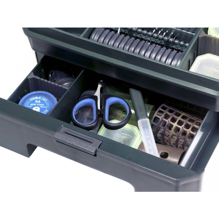 A large central recess accepts Prodigys revolutionary new Rig Board, plus there are two handy bin compartments to keep loose or discarded tackle in. The lower level has two unique side drawers, which allow access when the lid is closed - particularly useful while its being used for rig making purposes. The drawers boast secure catches and retainers, along with useful adjustable partitions and storage areas for larger items. The Klip-Lok Tackle Base allows you to perfectly organise your essential end tackle exactly how you want it.