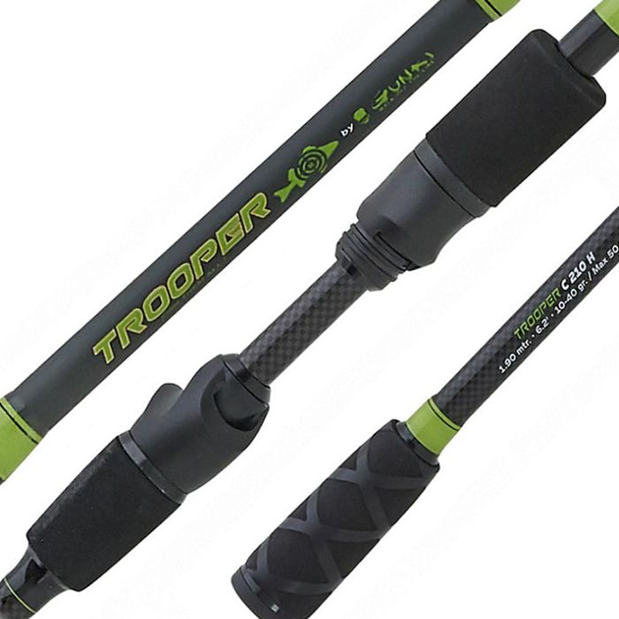 Zwei sehr preiswerte Casting-Ruten, die für das Angeln mit Ködern entwickelt wurden. Geteilter Rollensitz für direkten Kontakt mit dem Blank und bessere Bisserkennung. Die Aktion lässt sich am besten als vielseitige, schnelle Rute beschreiben, die sich für eine Reihe von Techniken eignet, von weichen Ködern bis hin zu Wobblern. Die TROOPER C-190MH eignet sich perfekt für kleine bis mittelgroße Köder, während die TROOPER C-210H mehr Power für größere Köder hat. M1 Carbon-Blanke und SIC-Ringe, zusammen mit einer TROOPER BC 200 Rolle ergibt sich eine ausgewogene Kombination, mit der das Fischen Spaß macht!