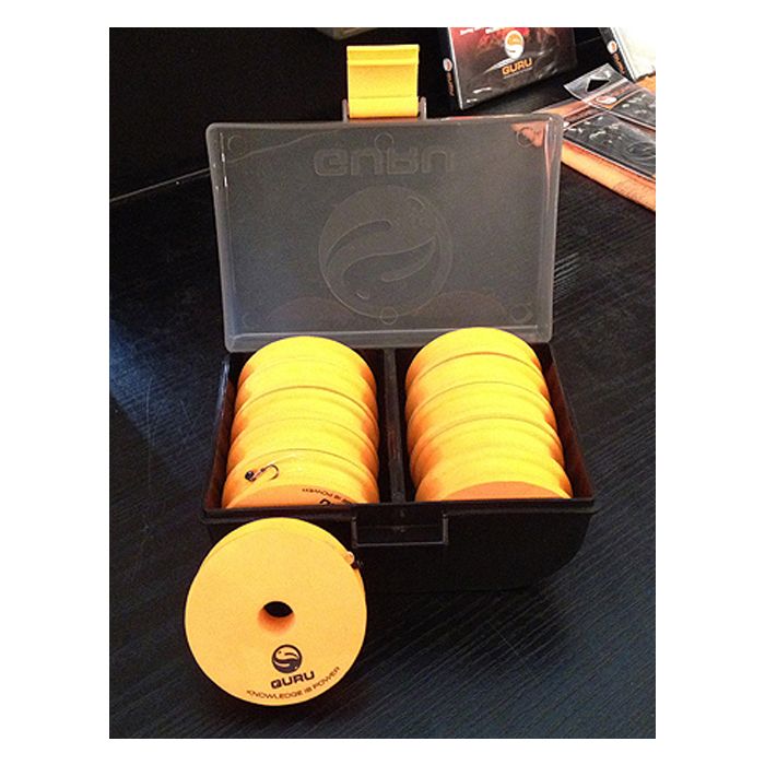 Die Guru Vorfachbox ist die ultimative Aufbewahrungsmöglichkeit für über 200 monofilen Specimen-Vorfächern. Sie wird inklusive 20 Pins zum Befestigen der Vorfächer als auch mit 10 EVA Spulen geliefert. Letztere schützen die Hakenspitze, halten diese scharf und verhindern das Verheddern der Vorfächer. Dieses universale System ist u.a. für Feeder, Bomb, Pellet Waggler, Hair Rigs, Booms, Leader, Zig Rigs oder Chod Rigs geeignet.