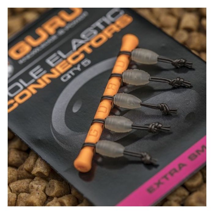 Die sehr kleinen Guru Elastic-Verbinder sind speziell dafür ausgelegt, eine gute Verbindung zwischen dem Gummizug und dem Vorfach herzustellen. Sie halten das Vorfach von der Rutenspitze fern, während der zweckmäßig gestaltete Perle dafür sorgt, dass es nach vorne zeigt, wodurch Verwicklungen minimiert werden.