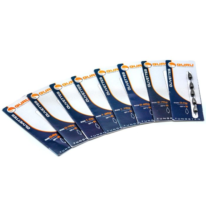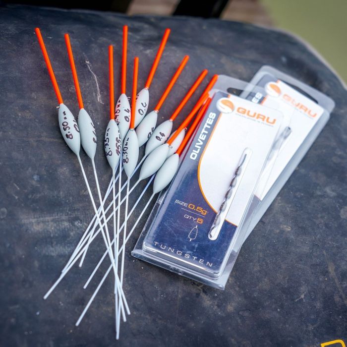 Die Guru Olivettes wurden speziell für den Einsatz mit Stippruten entwickelt. Mit einem einzigen Olivette können Sie das Gewicht des Schwimmers präzise ausbalancieren, und das auf saubere und kompakte Weise. Durch die Verwendung eines hochdichten Wolfram-Materials konnten wir extrem kleine, aber äußerst dichte Gewichte schaffen, die im Vergleich zu anderen Olivettes auf dem Markt deutlich kleiner sind. Dadurch bieten sie weniger Widerstand als größere Olivettes, verbessern die Präsentation und sind unauffälliger am Rig.