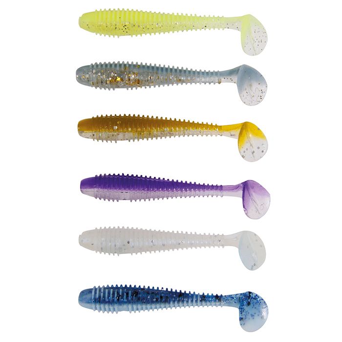 Diese Mini-Minnow sind aus Vinyl hergestellt, mit geripptem Körper und Paddelschwanz. Damit erzeugt er eine spektakuläre, lebendige Schwimmaktion. Die Rippen und der Schwanz sorgen auch dafür, dass sich der Köder auch bei langsamen Einholgeschwindigkeiten bewegt.