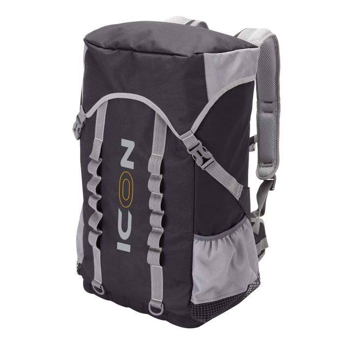Der stilvolle Icon-Rucksack ist in Schwarz-Grau ausgeführt und zeichnet sich durch sein reißverschlussfreies Design aus, damit man sich nicht an einem eiskalten Tag am Strand, mit gefühllosen Fingern mit einem Reißverschluss bemühen muss.