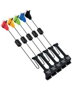 Beide werden auf die selbe Art und Weise an der Schnur befestigt, und halten diese sicher im Lauf des Bissanzeigers. So können Sie sicher sein, dass jeder Biss erkannt wird, und die Schnur an Ort und Stelle bleibt. Während ein Bobbin an einer Kette hängt, ist ein Swinger ein fester Stab, der auf ähnliche Weise vor dem Bissanzeiger angebracht wird.