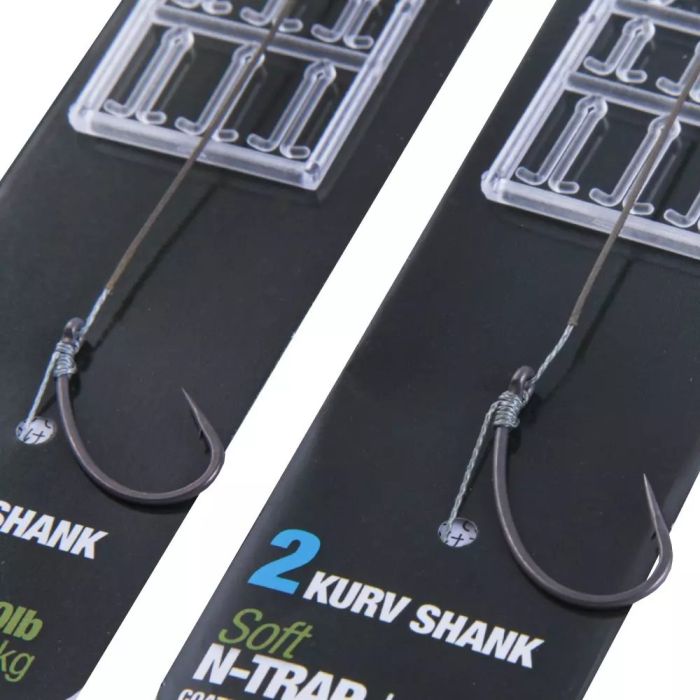 Ein vorgebundenes Vorfach, das aus einem Kurv Shank Haken und N-Trap Vorfachmaterial besteht. In der Packung sind zusätzlich noch die praktischen Extenda Stops enthalten.