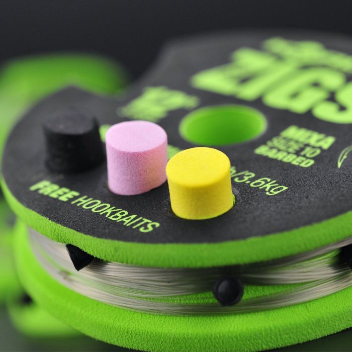 Eine Reihe an Zig Rigs mit verschiedener Tragkraft und 10er Mixa Haken. Geliefert auf leichten Schaumstoffspulen zusammen mit drei Schaumhakenködern in Schwarz, Gelb und Rosa.