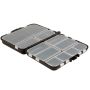 Eine leichte Kunststoff-Tackle-Box im Taschenformat. Sie hat 2 aufklappbare Seiten mit mehrfach austauschbaren Fächern und verstellbaren und festen Trennwänden.