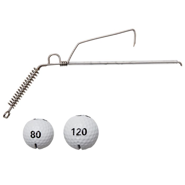 Jig-System-Kits für tote Köder mit austauschbaren Golfball-Bleiköpfen. Mit Golfdimples (zur Reduzierung des Luftwiderstands). Der große Vorteil ist, dass der Bleikopf sehr einfach gewechselt werden kann. Welches Gewicht angebracht werden sollte, hängt von der Größe des Köderfisches, der Wassertiefe oder der Strömung ab. Ein weiterer großer Vorteil ist der Winkel, in dem sich der Köderfisch befindet, wenn das Blei auf dem Grund platziert wird: in einem Fresswinkel. Das führt zu mehr Fängen. Außerdem wird das Risiko, sich am Grund zu verheddern, erheblich verringert. Zwei Kits sind erhältlich: eines mit einem 80- und 120-Gramm-Bleikopf und eines mit einem 140- und 180-Gramm-Bleikopf.