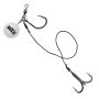 Vertikales Jig-System mit Clip-On-Bleikugel mit Golfball-Dimples (um den Widerstand zu reduzieren). Alle Teile (Wirbel, Spaltring, Vollring, Geflecht, Einzelhaken und Drilling) sind hochbelastbar. Sofort einsatzbereit. Welche Montage und/oder welches Gewicht Sie wählen sollten, hängt von der Strömung, der Wassertiefe und/oder der Größe des Köderfischs ab. Lose Kugeln in verschiedenen Gewichten sind erhältlich.