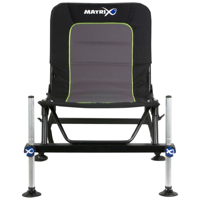 Ein leichter Aluminium/Stahl-Stuhl von Matrix, der für das Feeder- oder Posenfischen entwickelt wurde, mit einer niedrigen Rückenlehne, die das Werfen und Manövrieren erleichtert.