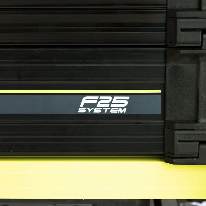 Die F25 ist mit einem entfernbarem, gepolstertem Tragegurt ausgestattet, verfügt über eine kratzfeste, feststellbare Fußplatte und thront auf sechs teleskopischen Beinen. Diese haben einen Durchmesser von 25 mm und die daran angebrachten drehbaren Matschfüße gewährleisten einen sicheren Stand an jedem Gewässer und auf jedem Untergrund.