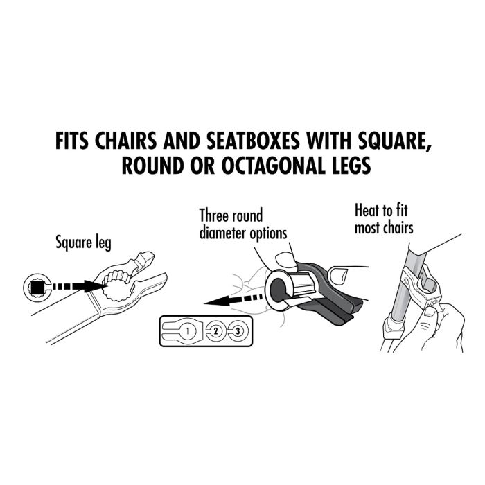 Das Herzstück des Systems mit StarGrip-Technologie. Die Klamern drehen sich um 360°. Einfaches Aufstellen denn es passt an das Bein einer Sitzbox oder eines Stuhls von vielen Sitzkiepenmarken. Beine: runde (inkl. 25 mm), achteckige und quadratische Beine, aber es ermöglicht eine individuelle Anpassung.