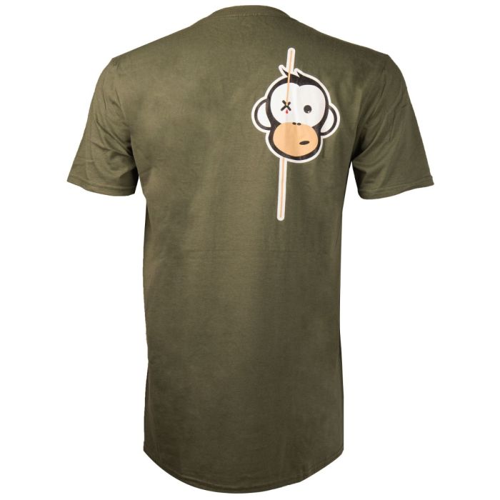Auf der T-shirt Vorderseite (links oben) auf der Schulter ist ein kleiner, vorsichtiger weiß-gelber Aufdruck des Monkey Climber-Logos zu sehen, und auf der Rückseite des T-Shirts befindet sich der ikonische Affe mit einem durchlöcherten Auge, was dem T-Shirt eine komische, moderne Richtung der Karpfenmode verleiht.